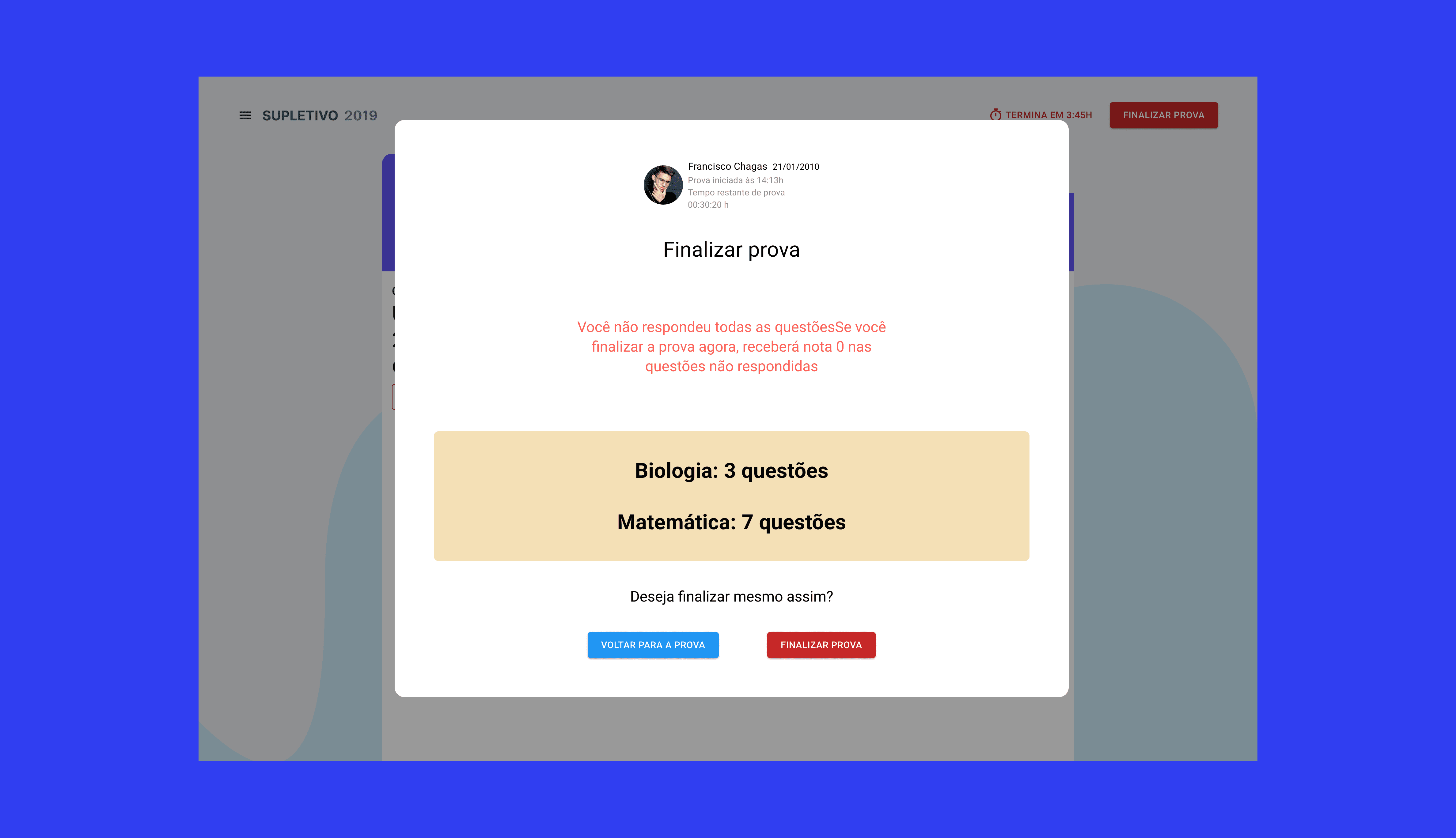 O timer da prova causava ansiedade, e prejudicava o resultado do usuário, o deixamos mais discreto e adicionamos avisos sonoros em intervalos especificos de tempo